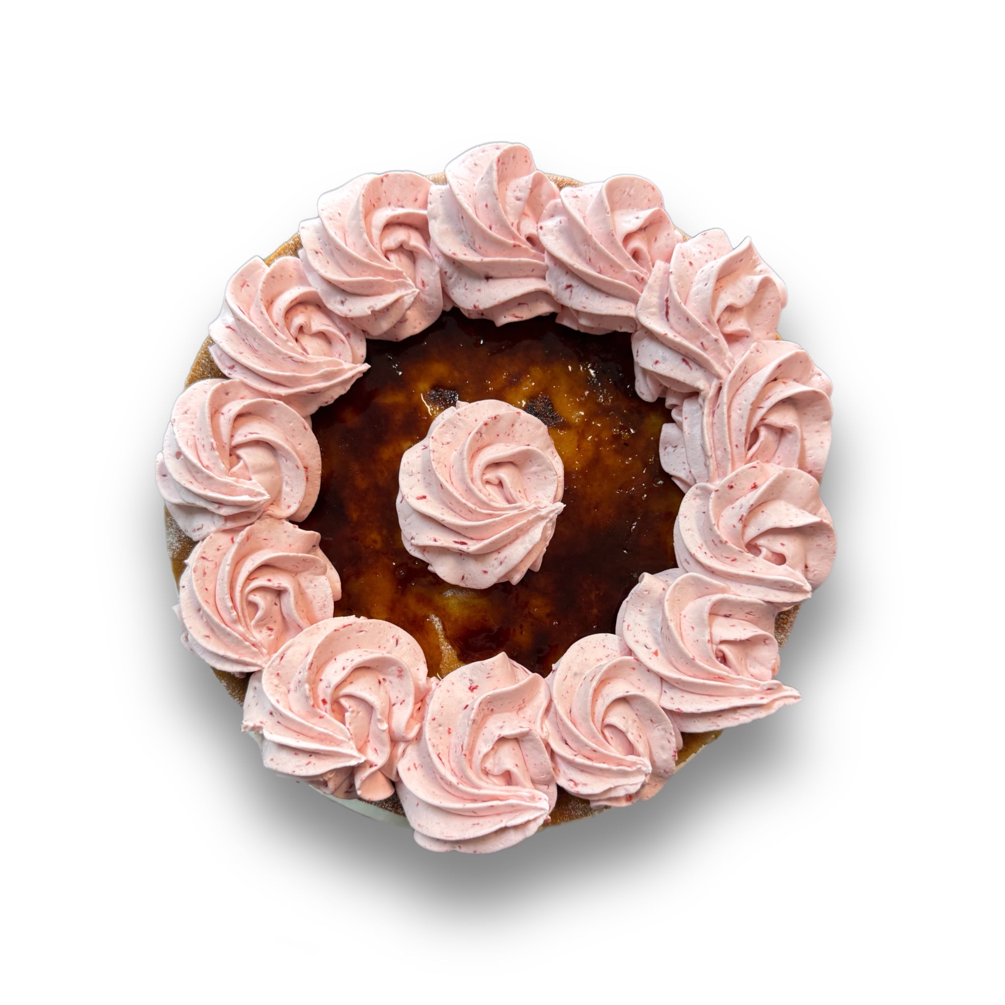 Rich, custardy focused cheesecake, topped with sugar and toasted like creme brûlée. Finished with raspberry whipped cream and raspberries.